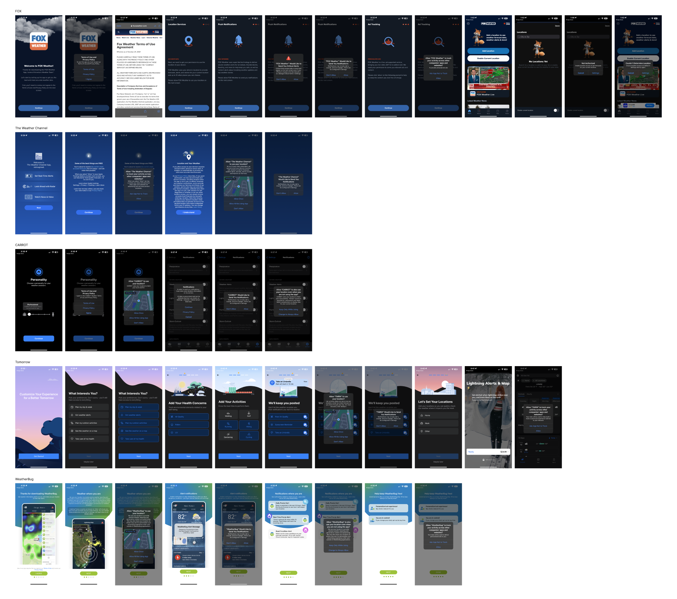 Most of our weather app competitors followed the pattern of [full screen explanation > OS prompt]. Fox had the longest onboarding process but the process didn’t feel as long because of the simple steps and icons on each step. All competitors also had clear buttons for each step that allowed for a lighter cognitive load on the user, but some explanations (especially on location sharing screen) were very long. Many competitors also had their logo on the first welcome screen but omitted in future steps.