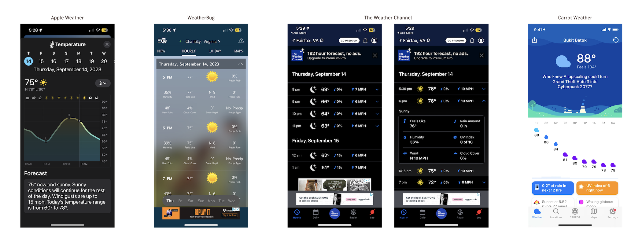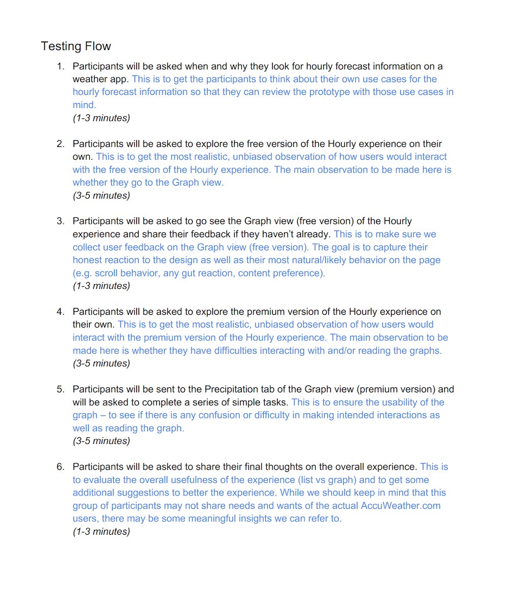 I conducted external interviews with Weather app users about how they view the hour-by-hour forecast on their favorite weather app to determine the biggest pain points and strengths of the different Hourly views available.