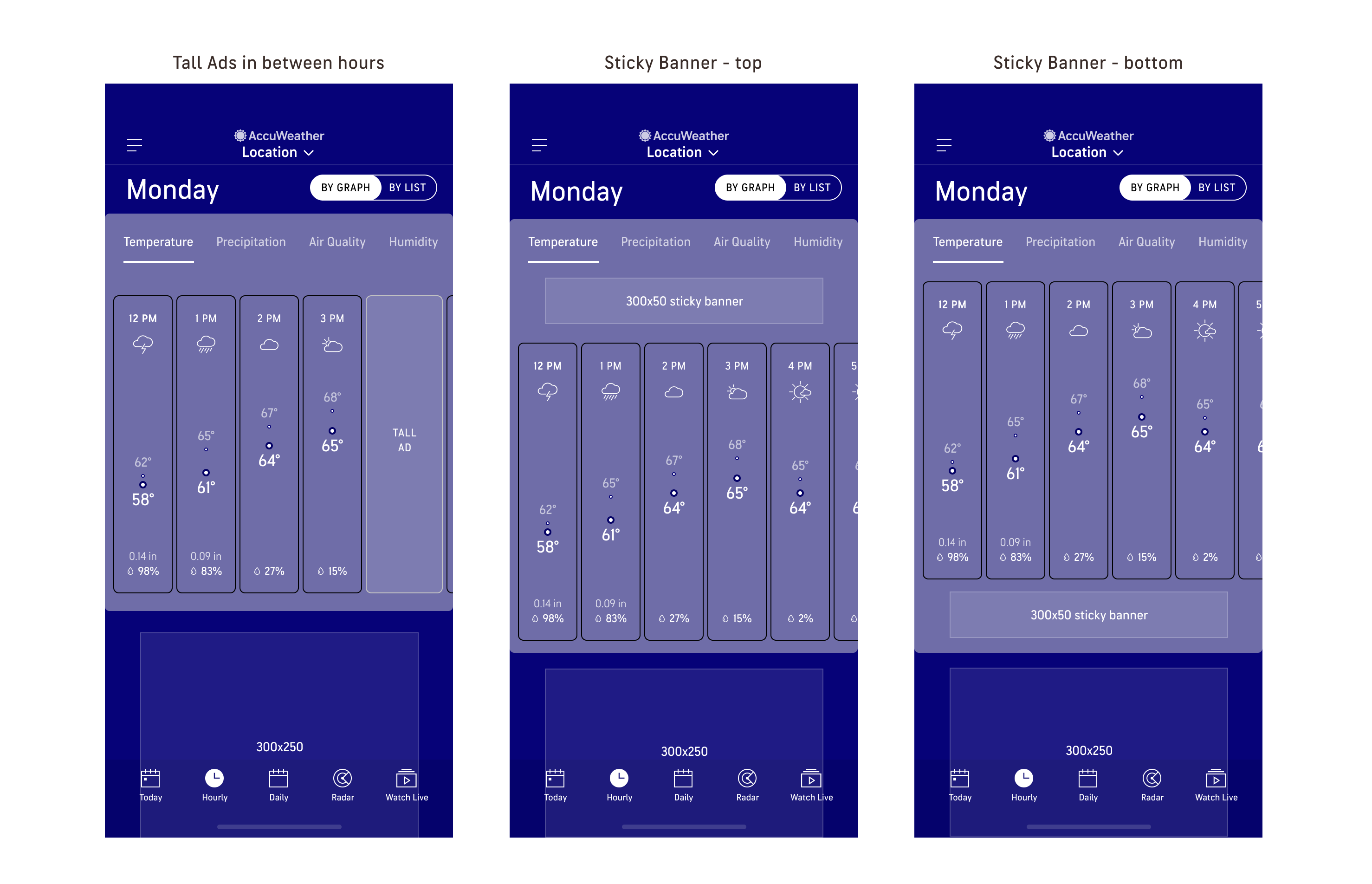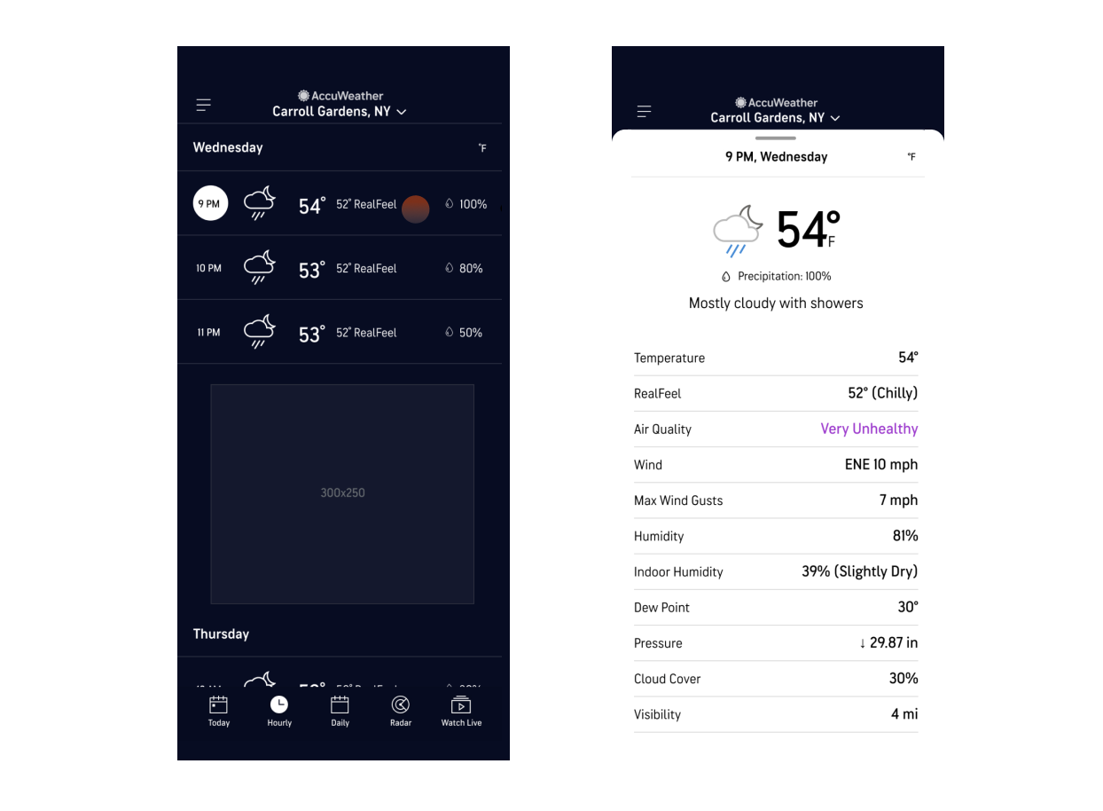 The old AccuWeather Hourly page only had a List view that showed around 3-5 hours on landing (with ads in between) that makes seeing the overall hourly trends at a glance impossible. Users must tap into each hour to see the detailed data points like UV index, wind and air quality and scroll to find out information about later hours.