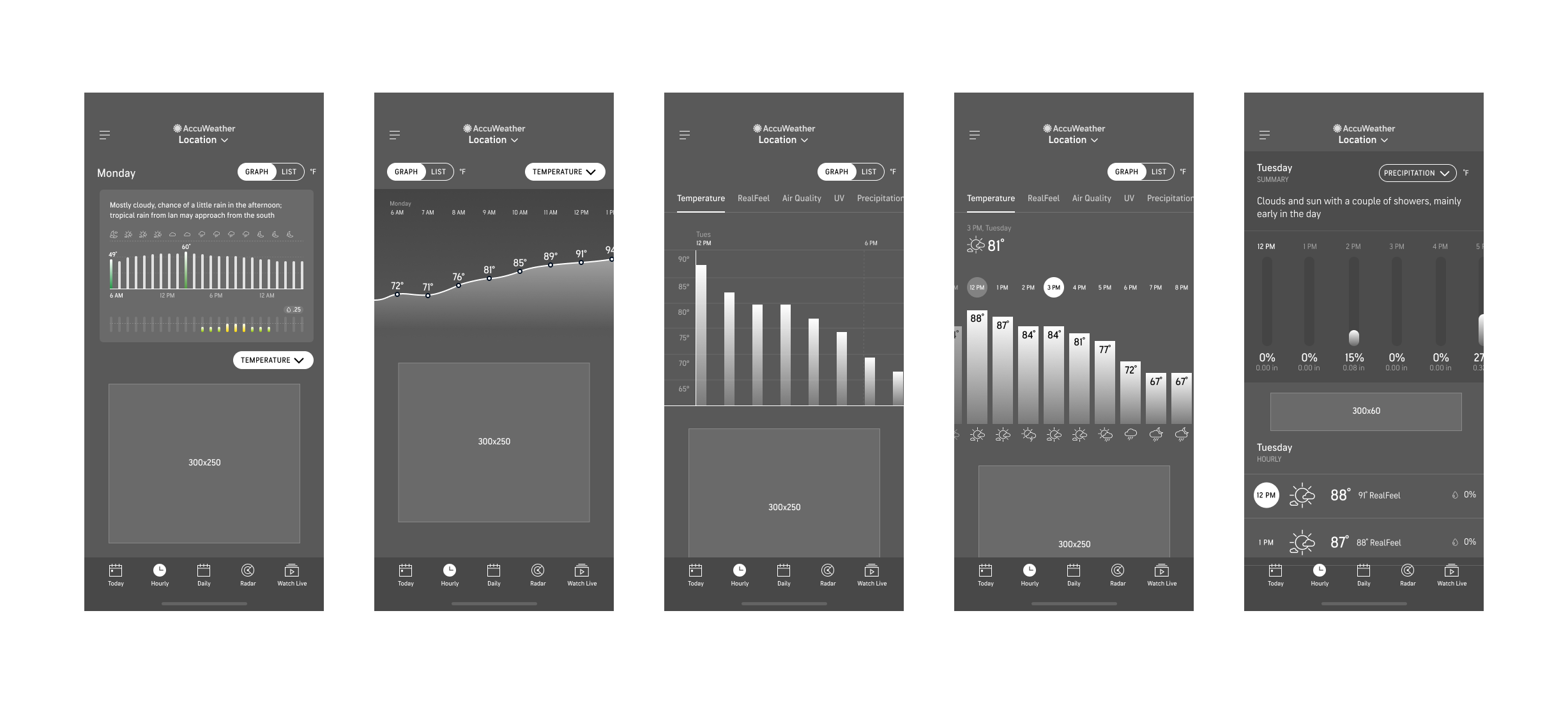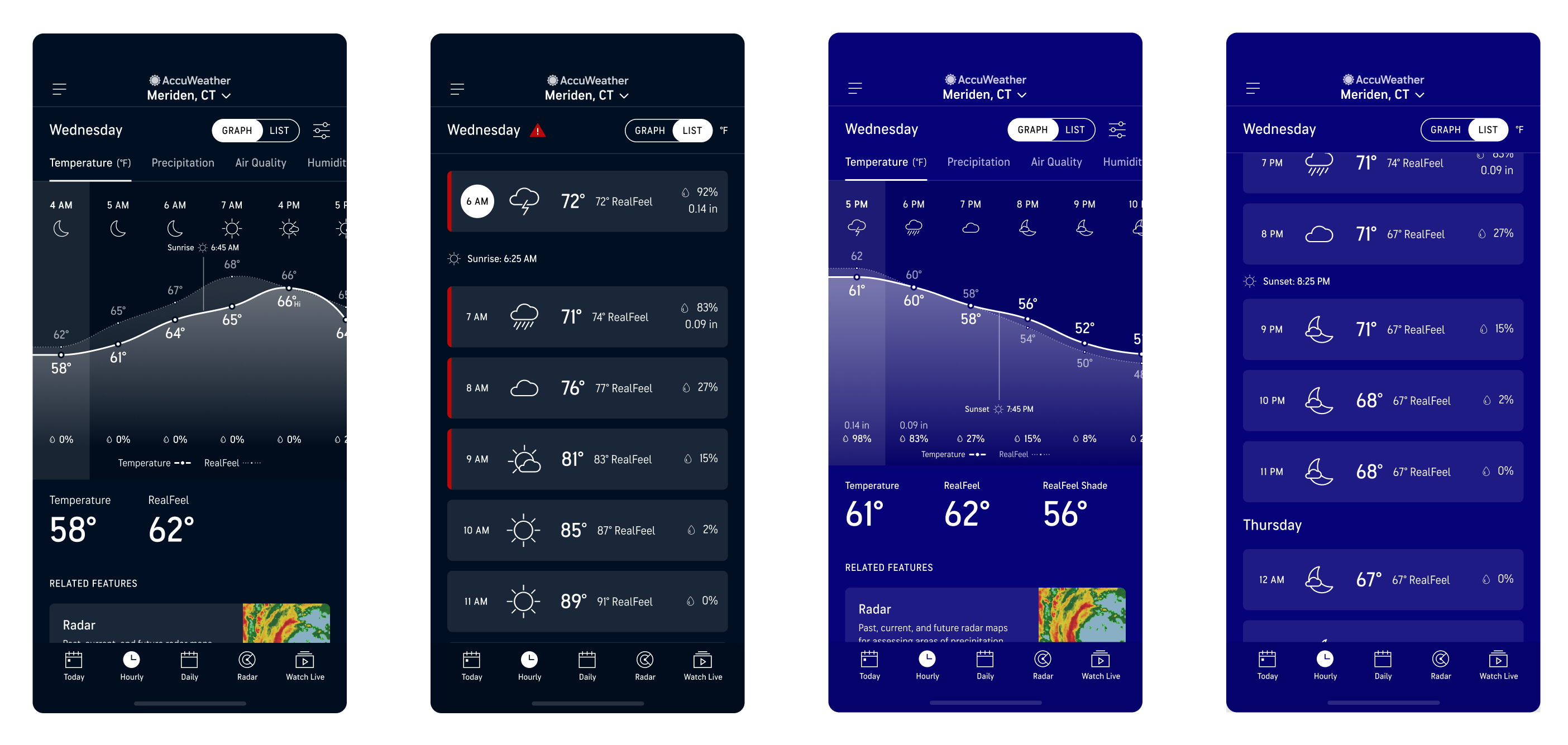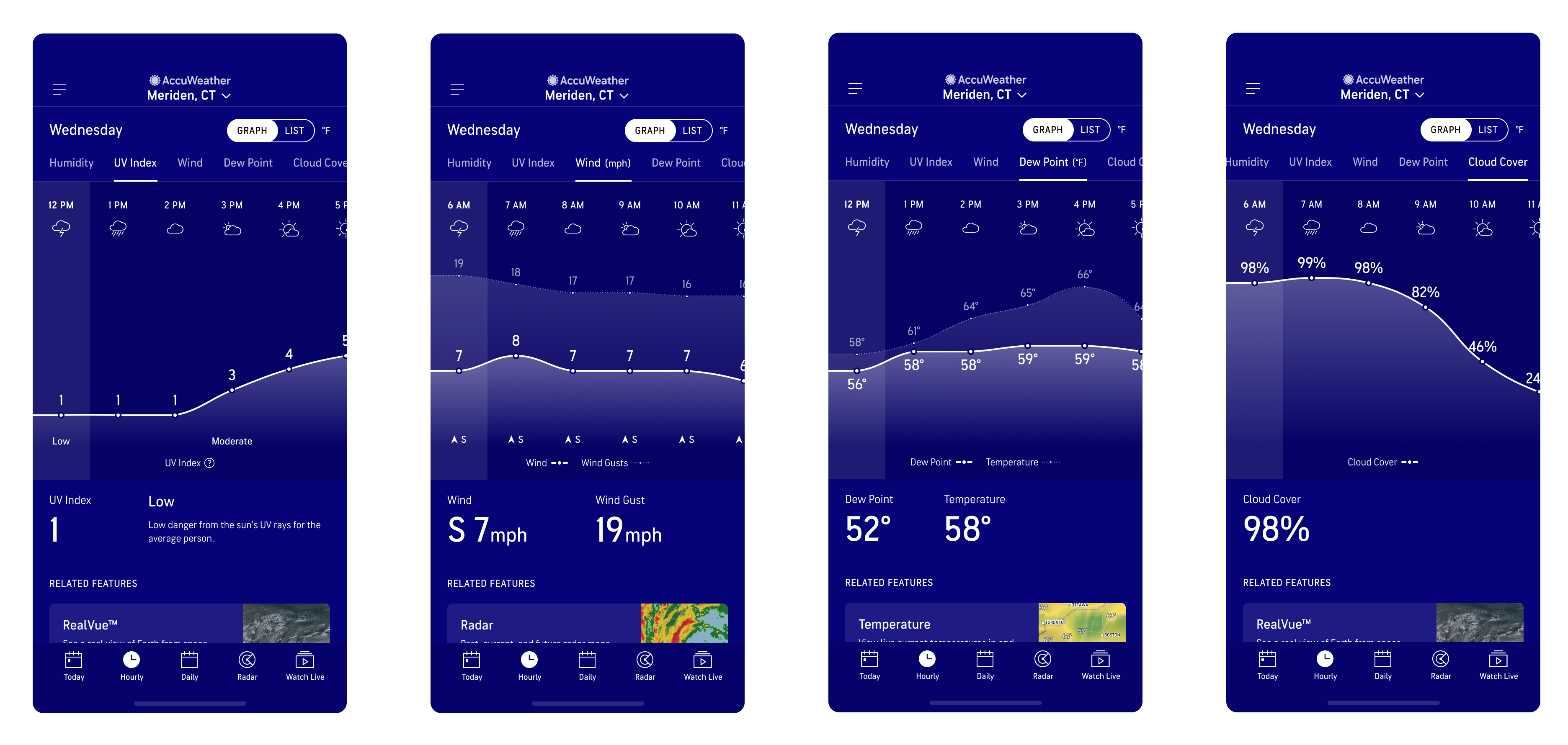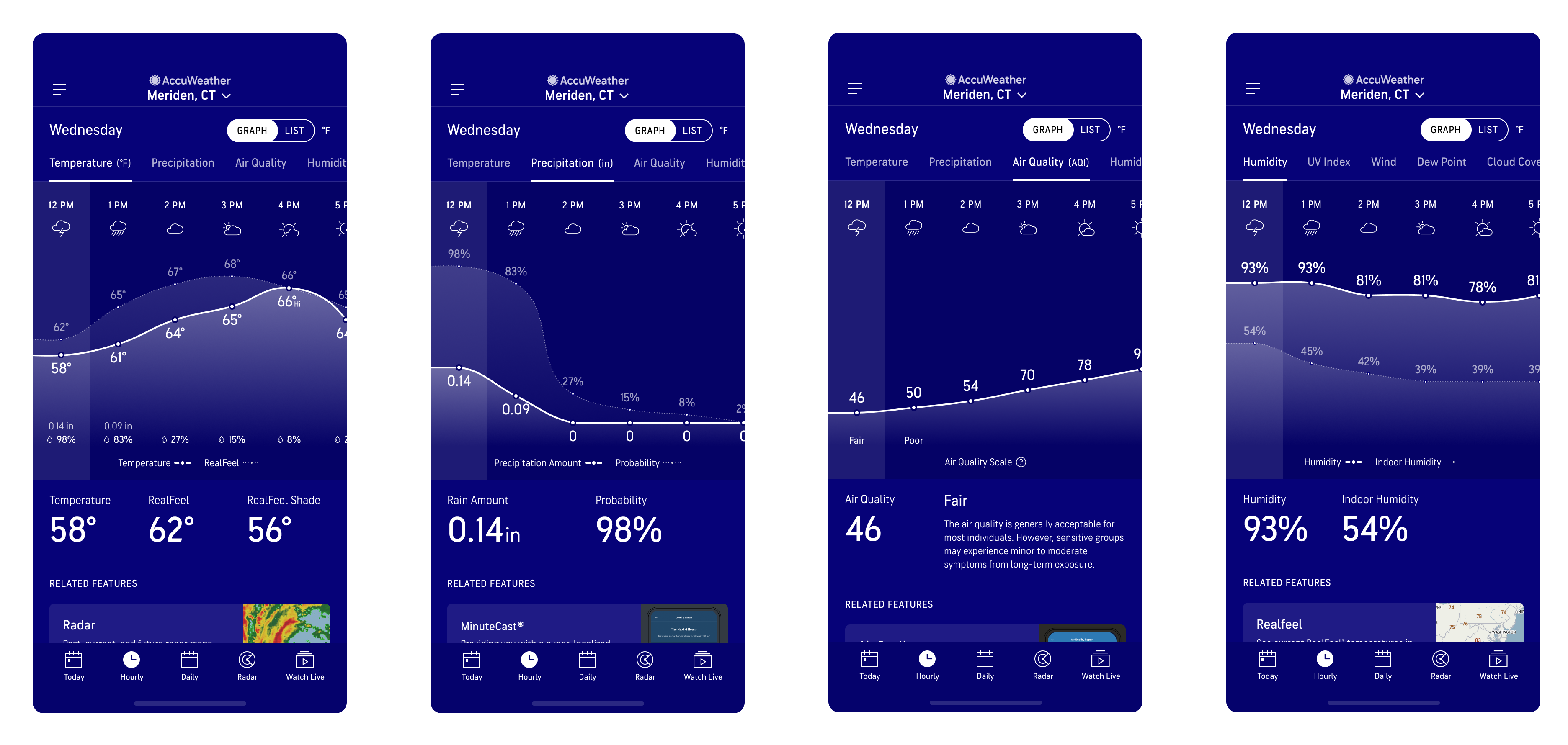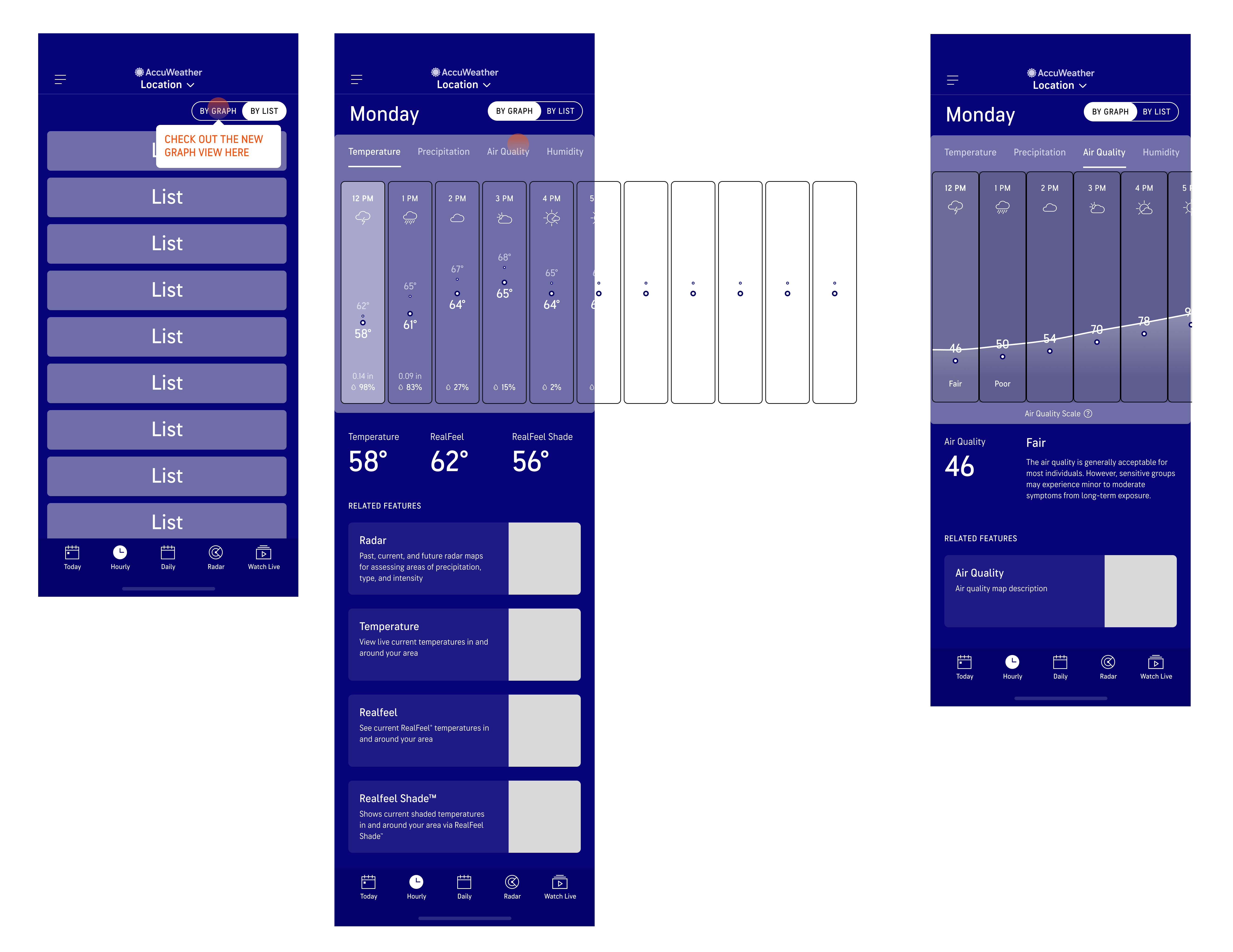 Most of our weather app competitors either had just a Graph view or a version of List view to display hourly weather data. Both views had their pros and cons as Graph view is best for a quick overview of the entire day but harder to gauge the specific details of each hour, while List view had the details but lacked the quick, scannable experience. Because of the strengths of both styles of data visualization, both views are necessary for a more robust hourly experience that will also set the AccuWeather app apart from our competitors.