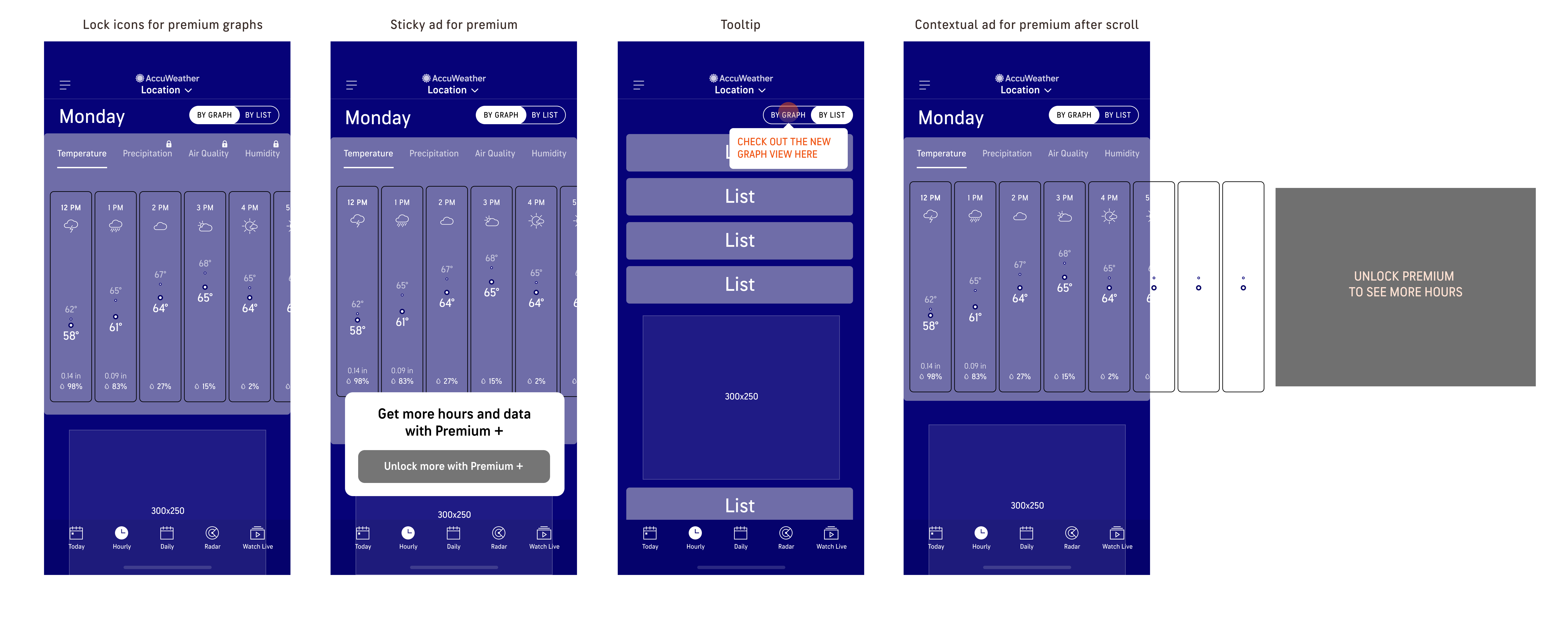 Explored contextual upsell opportunities as to not disrupt the weather viewing experience too much.